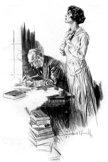 "Never mind, Olwen fach," he said, with a hand on her shoulder. "There won't be much work done this morning. I'm going into the woods. Just hand me my specimen-case ... ah, here. And file the June numbers of that Danish magazine—where on earth did I put 'em?—ah, there. Then there are a couple of letters to copy into the book, and that's all. You can come on and find me; I shall be where we went yesterday with Mrs. Cartwright and that young What's-his-name, the flying officer."