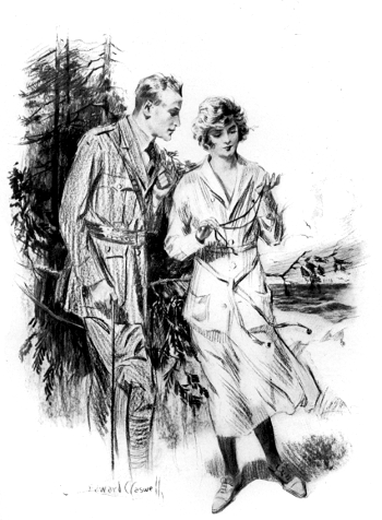 The Professor's back was to her as the figures passed quickly out from below the balcony. He caught a glimpse of the two wounded British officers swinging off towards the plage. He caught the gleam of scarlet on khaki; heard a snatch of the rather husky boyish laughter of one of them; a scrap talk of the other. In a resonant voice with that particularly dominant form of accent, Scots with a dash of Canadian, there floated up through the clear morning air this somewhat arrested announcement: