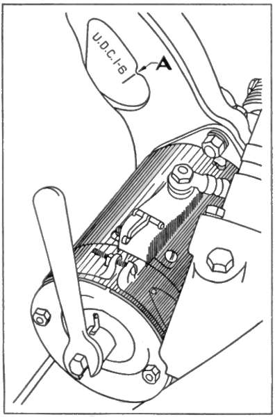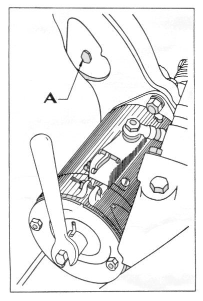 Use only a mixture composed of 1/2 kerosene and 1/2 engine oil. Turn starter shaft with wrench, moving wrench handle toward the engine until plug "A" is accessible through opening in rear engine plate. Remove plug "A," continue turning flywheel until opening is down and all clutch oil is drained. Then turn until opening is again accessible. Pour in by means of offset funnel no more than 1/3 pint of clutch mixture. Replace plug "A" and tighten securely. The clutch oil should be drained and replenished at least every 5000 miles.