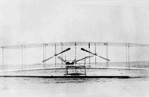 Kitty Hawk Flyer with original Wright engine poised on launching rail at Kill Devil Hill, near Kitty Hawk, North Carolina, 24 November 1903, the month before the Wrights achieved man's first powered and controlled flight in a heavier-than-air craft.