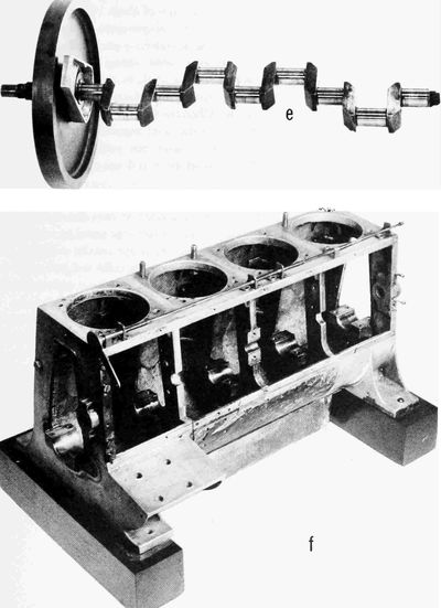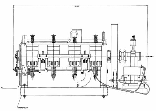The crankshaft was made from a solid block of relatively high carbon steel which, aside from its bulk and the major amount of machining required, presented no special problems. It was heat-treated to a machinable hardness before being worked on, but was not further tempered. The design was an orthodox straight pin and cheek combination and, as previously noted, there were no counterweights to complicate the machining or assembly. A sizable bearing was provided on each side of each crank of the shaft, which helped reduce the stiffness requirement.