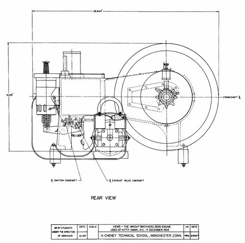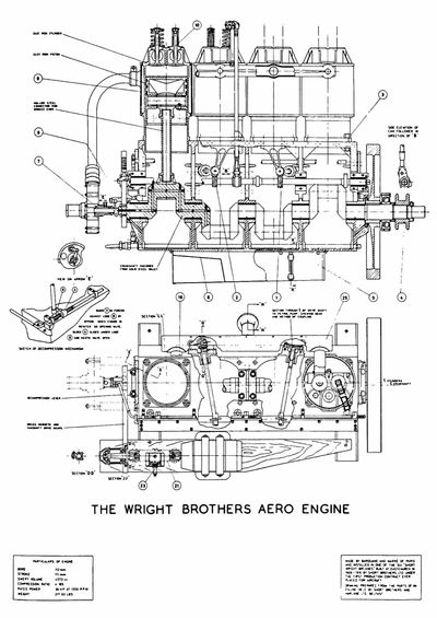 There are in existence, however, two complete sets of drawings, both of which purport to represent the 1903 flight engine. One set was made in England for the Science Museum in the two years 1928 and 1939. The 1928 drawings were made on receipt of the engine, which was not disassembled, but in 1939 the engine was removed from the airplane, disassembled, the original 1928 drawings were corrected and added to, and the whole was made into one very complete and usable set. The other set was prepared in Dayton, Ohio, for Educational and Musical Arts, Inc.,[6] and was donated to the Smithsonian Institution. This latter set was started under the direction of Orville Wright, who died shortly after the work had been commenced.