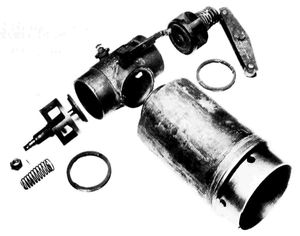 The basic intake manifold (see Figure 5) consisted of a very low flat box of sheet steel which ran across the tops of the valve boxes and was directly connected to the top of each of them so that the cages, and thus the valves, were open to the interior of the manifold. Through an opening in the side toward the engine the manifold was connected to a flat induction chamber (21, Figure 5) which served to vaporize the fuel and mix it with the incoming air. This chamber was formed by screw-fastening a piece of sheet steel to vertical ribs cast integral with the crankcase, the crankcase wall itself thus forming the bottom of the chamber. A beaded sheet-steel cylinder resembling a can (73, Figure 6) but open at both ends was fastened upright to the top of this chamber. In the absence of anything else, this can could be called the carburetor, as a fuel supply line entered the cylinder near the top and discharged the fuel into the incoming air stream, both the fuel and air then going directly into the mixing chamber. The can was attached near one corner of the chamber, and vertical baffles, also cast integral with the case, were so located that the incoming mixture was (p. 24) forced to circulate over the entire area of exposed crankcase inside the chamber before it reached the outlet to the manifold proper, the hot surface vaporizing that part of the fuel still liquid.