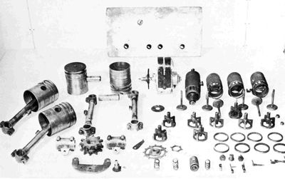 The intake and exhaust valves were identical and of two-piece construction, with the stems screwed tightly into and through the heads and the protruding ends then peened over. This construction was not novel, having had much usage behind it, and it continued for a long time in both automobile and aircraft practice. One-piece cast and forged valves were available (p. 19) but here again it was a choice of the quick, cheap, and proven answer.