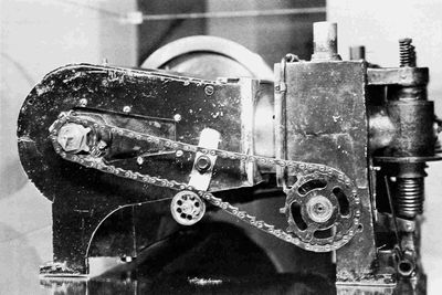 The very substantial advantages of the chain drive were not, however, obtained at no cost. Torque variations in the engine would tend to cause a whipping action in the chain, so that it was vulnerable to rough running caused by misfiring cylinders and, with the right timing and magnitude of normal regular variations, the action could result in destructive forces in the transmission system. This was the basic reason for the Wrights' great fear of "engine vibration," which confined them to the use of small cylinders and made a fairly heavy flywheel necessary on all their engines. When they were requested to install an Austro-Daimler engine in one of their airplanes, they designed a flexible coupling which was interposed between the engine and the propeller drive and this was considered so successful that it was applied to the flywheel of some engines of their last (p. 13) model, the 6-70, "which had been giving trouble in this regard."[11]
