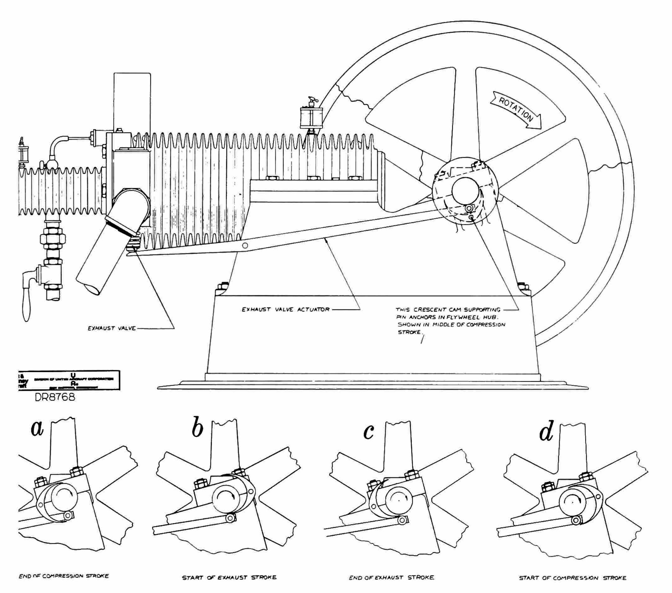Why they continued with this form on their later engines is a question a little more difficult to answer, as they were then seeking more and more power and were building larger engines. The advantages of simplicity and a reduced number of parts still existed, but there also was a sizable power increase to be had which possibly would have more than balanced off the increased cost and weight. They did not utilize mechanical operation until after a major redesign of their last engine model. Very possibly the answer lies in the phenomenon of fuel detonation. This was only beginning to be understood in the late 1920s, and it is quite evident from their writings that they had little knowledge of what made a good fuel in this respect. It is fairly certain, however, that they did know of the existence of cylinder "knock," or detonation, and particularly that the compression ratio had a major effect on it. The ratios they utilized on their different engines varied considerably, ranging from what, for that time, was medium to what was relatively high. The original flight engine had a compression ratio of 4.4:1. The last of their service engines had a compression ratio about twenty percent under that of the previous series—a clear indication that they considered that they had previously gone too high. Quite possibly they concluded (p. 21) that increasing the amount of the cylinder charge seemed to bring on detonation, and that the complication of the mechanical inlet valve was therefore not warranted.