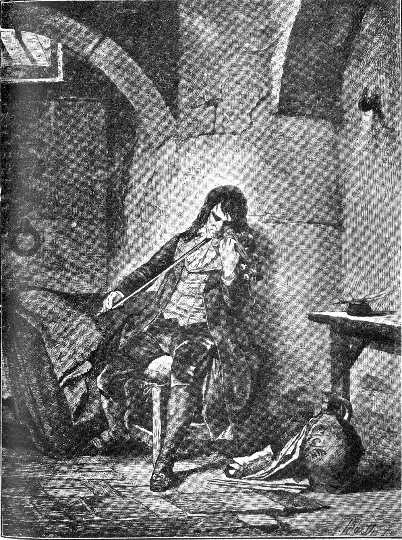One has to bear in mind that at the period now under notice—1798—Europe was in a very unsettled state. The very pillars of society were shaken, and there were many dangers in the path of the young and inexperienced. But that is a very trite observation, for it applies to all times and places. However, Paganini seems to have become acquainted with what Fétis terms "artists of another kind," who encouraged "play" of a more exciting, if less exalted order, than the young musician had hitherto devoted himself to. With his ardent southern temperament Paganini threw himself with the greatest zest into the vortex of gambling, and frequently lost at a sitting the earnings of several concerts and was reduced to the greatest embarrassment. Soon his talent provided fresh resources, and his days ran on in alternations of good and evil fortune. Tall, slight, delicate and handsome,[3] Paganini, despite his frail constitution, was an object of attraction to the fair sex. Incidents in his early manhood probably formed the foundation for some of the stories told of him later. As Fétis puts it; the enthusiasm for art, love and "play," reigned by turns in his soul. He ought to have been careful of himself, but he went to excess in everything. Then came a period of enforced repose, of absolute exhaustion, lasting sometimes for weeks. This would be followed by a display[15] of extraordinary energy, when his marvellous talent took its highest flights, and he plunged once more into the wildest bohemianism. Such a course of life was enough to wreck the artist, and no friend seemed to be at hand to save him from himself. Frequently he had to part with his violin in order to raise money to pay his debts of honour, and it was upon one such occasion that he met with the greatest good fortune he had yet experienced, and acquired a violin which became the instrument of his conversion from the fatal passion for gambling.