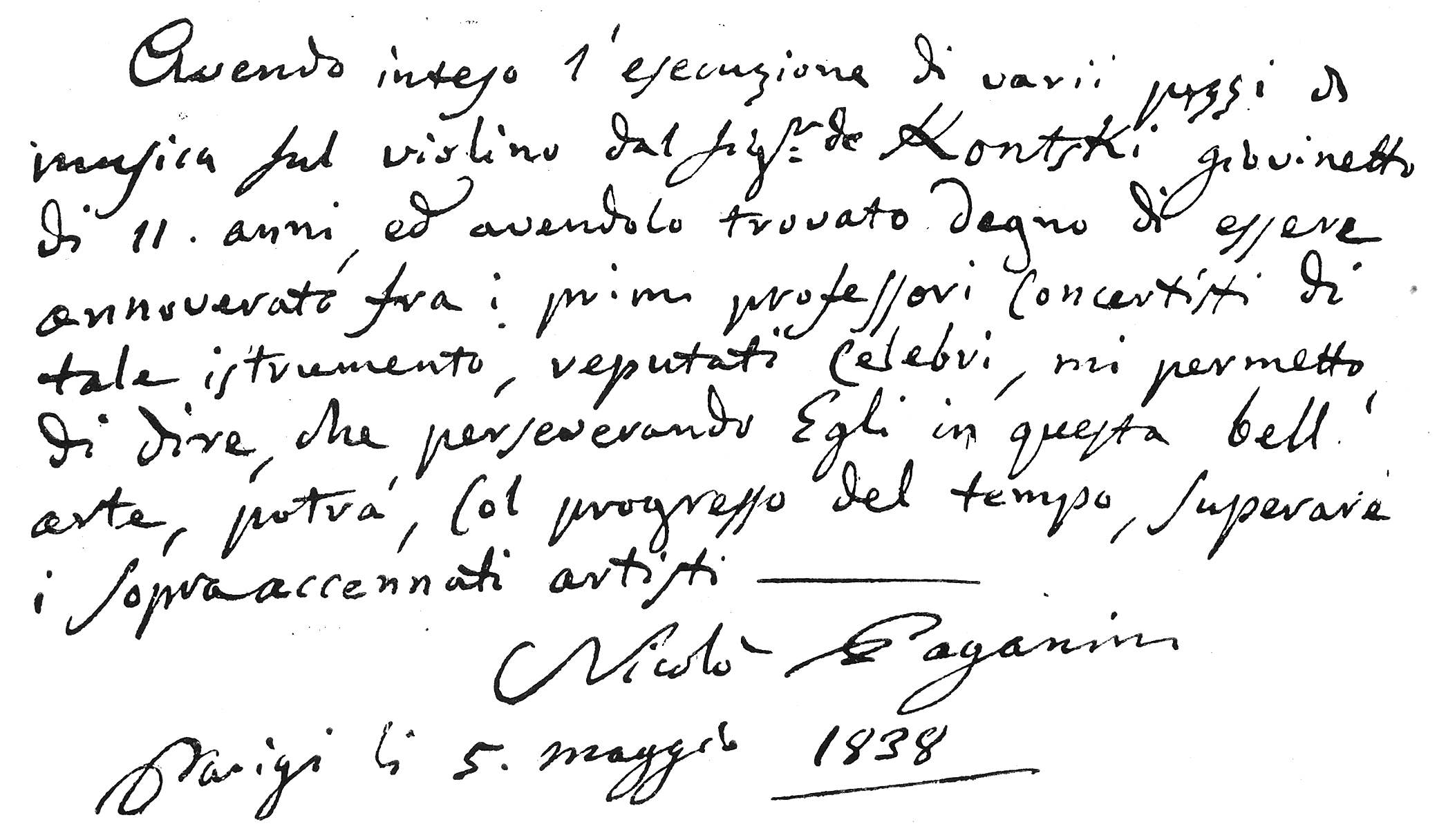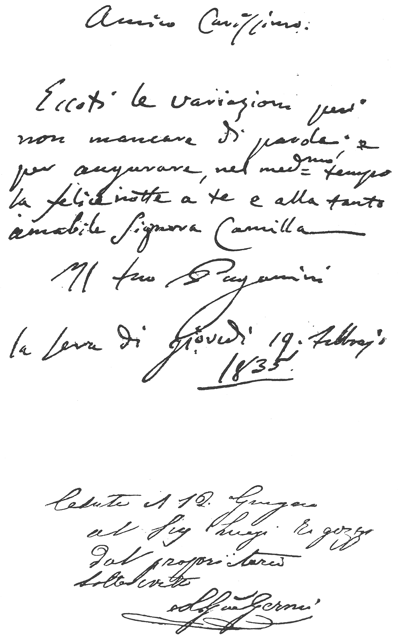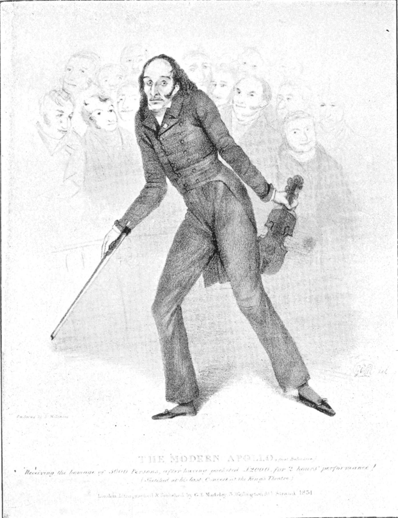(Paganini will cause his violin to be heard.) He was received with no less enthusiasm than at Milan. Paganini then returned to Genoa, but soon left for Venice.[33] There he formed an union with Antonia Bianchi, the young singer he introduced at Genoa, who became his companion, sang at his concerts, and shared his triumphs.