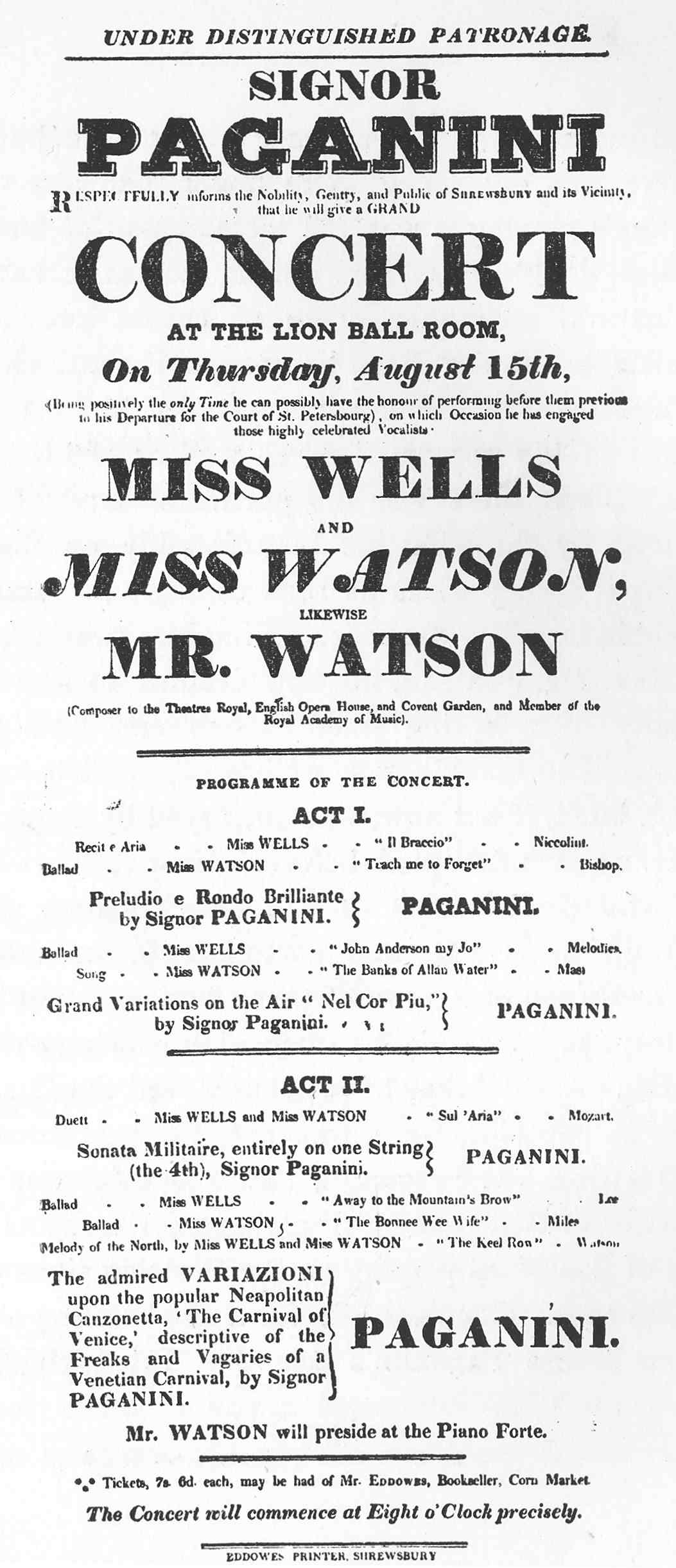 In 1825, Paganini was again at Naples, where he gave a concert, causing his name to be announced in the bills as—