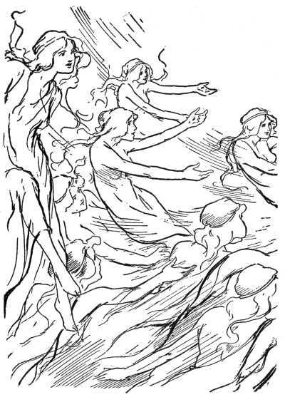 At the right of the Sorceress stood Audah and Aurah, while at the left stood the Wizard and Aujah. Together they stretched their arms over the water's edge and in unison the five chanted a rhythmic incantation.
