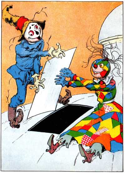 The Wizard now discovered that the rope was long enough to reach from the top of the Dome to the ground when doubled, so he tied a chair to one end of the rope and called to Glinda to sit in the chair while he and some of the Skeezers lowered her to the pavement. In this way the Sorceress reached the ground quite comfortably and the three Adepts and Ervic soon followed her.