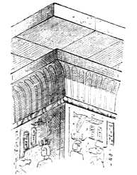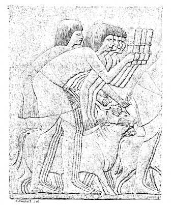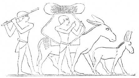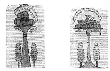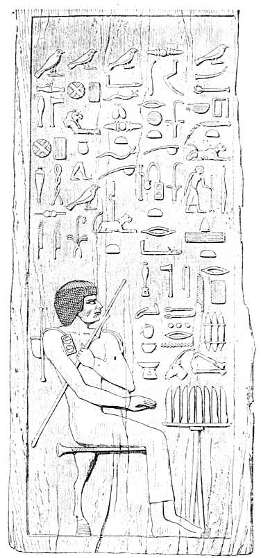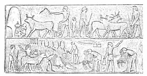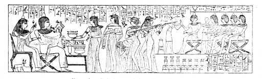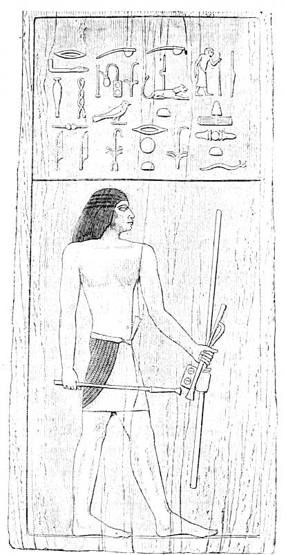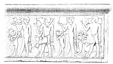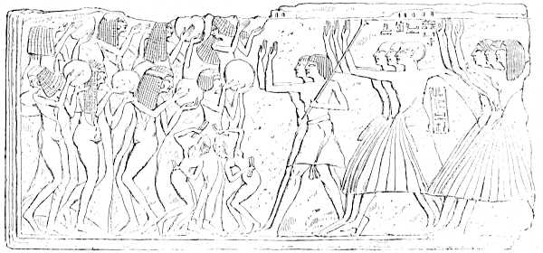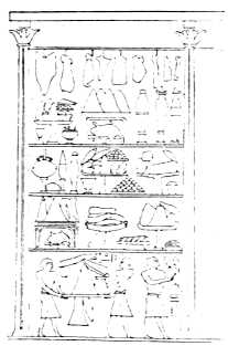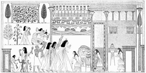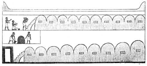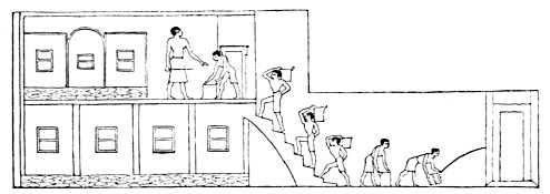 It may be said that this part of the picture represents an awning or veranda in front of the house. But, in that case, how are we to explain the objects which are arranged at the top of it—jars, loaves of bread, and other house-keeping necessaries? It cannot be a veranda with a granary on the top of it. Such a store-room would have to be carefully closed if its contents were to be safe-guarded from the effects of heat, light, and insects. It would therefore be necessary to suppose that the Egyptian painter made use of an artistic license not unknown in our own days, and suppressed the wall of the store-room in order to display the wealth of the establishment. By this means he has given us a longitudinal section of the building very near the external wall. There is no trace of an open story above. The latter seems to have existed only on that side of the house which was in shade during the day and exposed after nightfall to the refreshing breezes from the north.