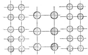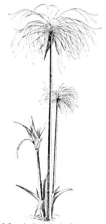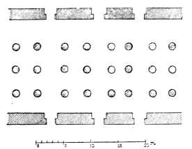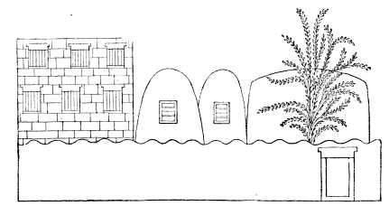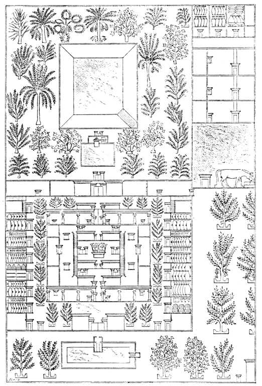 They are, as a fact, plans, but plans made upon a very different principle from those of our day. Certain elements, such as walls, are indicated by simple lines varying in thickness, just as they might be in a modern plan, giving such a result as would be obtained by a horizontal section. But this is the exception. The houses, the trees, and everything with any considerable height, are shown in projection, as they might appear to the eye of a bird flying over them if they had been overthrown by some considerate earthquake, which had laid them flat without doing them any other injury. As a rule all objects so treated are projected in one and the same direction, but here and there exceptions to this are found. In a country villa figured upon one of the tombs at Thebes (Fig. 3), one row of trees, that upon the right, is projected at right angles to all the others. The reason for this change in the artist's7 system is easily seen. Unless he had placed his trees in the fashion shown in the cut, he would not have been able to give a true idea of their number and of the shade which they were calculated to afford.