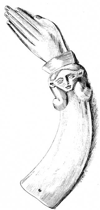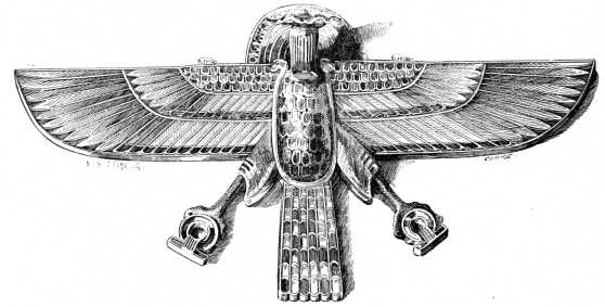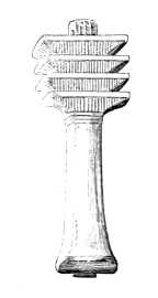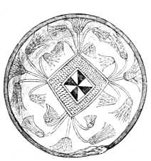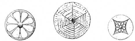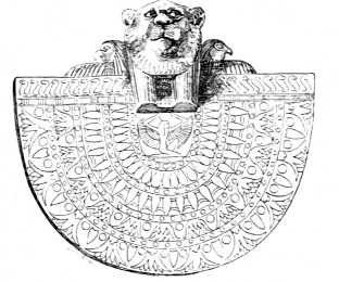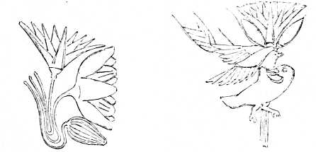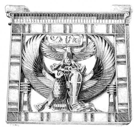 This picture presents us, then, with a peculiar kind of elevation; an elevation which, by projection, shows three sides of the house and hints at a fourth. Representations which are still more conventionalized than this are to be found in many places. The most curious of these are to be found in the ruins of the capital of Amenophis IV., near the village of Tell-el-Amarna. It was in that city that the heretical prince in question inaugurated the worship of the solar disc, which was represented as darting rays6 terminating in an open hand (see Fig. 2). Among these ruins we find, upon the sculptured walls of subterranean chambers, representations of royal and princely villas, where elegant pavilions are surrounded by vast offices and dependencies, by gardens and pieces of ornamental water, the whole being inclosed by a crenellated wall. These representations were called by Prisse plans cavaliers, a vague term which hardly gives a fair idea of the process, which deserves to be analysed and explained.