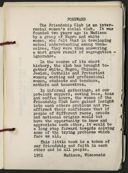 The Friendship Club is an inter-racial women's social club. It was founded two years ago in Madison by a group of Negro and white women, who felt that in developing mutual understanding among themselves, they were thus answering a most grave result of segregation—ignorance.