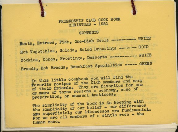 In informal gatherings, at our pot-luck suppers, sewing bees, teas and coffee hours, the women of the Friendship Club have gained insight into each others problems and re-affirmed their confidence that if people of different races, creeds and national origins would but have the opportunity to know and appreciate each other, it would be a long step forward towards solving some of the trying problems which face us all.