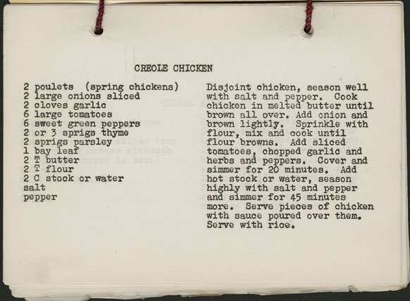 Disjoint chicken, season well with salt and pepper. Cook chicken in melted butter until brown all over. Add onion and brown lightly. Sprinkle with flour, mix and cook until flour browns. Add sliced tomatoes, chopped garlic and herbs and peppers. Cover and simmer for 20 minutes. Add hot stock or water, season highly with salt and pepper and simmer for 45 minutes more. Serve pieces of chicken with sauce poured over them. Serve with rice.