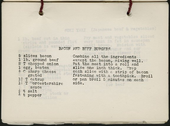 Combine all the ingredients except the bacon, mixing well. Pat the meat into a roll and slice one inch thick. Wrap each slice with a strip of bacon fastening with a toothpick. Broil or pan broil 5 minutes on each side.