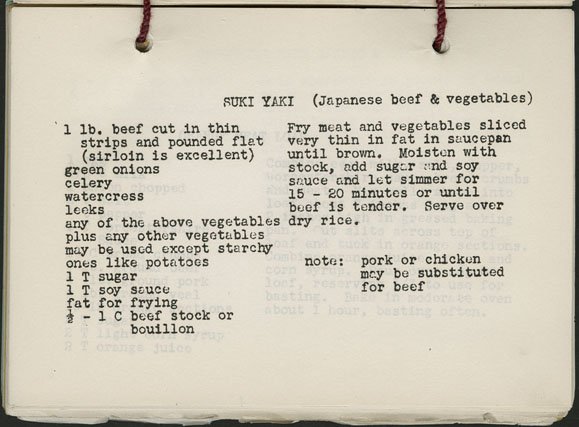 Fry meat and vegetables sliced very thin in fat in saucepan until brown. Moisten with stock, add sugar and soy sauce and let simmer for 15-20 minutes or until beef is tender. Serve over dry rice.