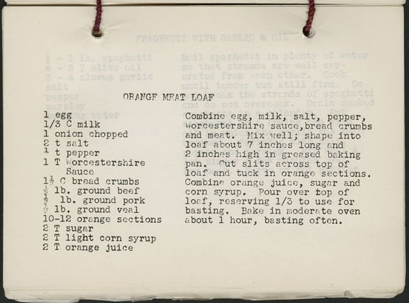 Combine egg, milk, salt, pepper, Worcestershire sauce, bread crumbs and meat. Mix well; shape into loaf about 7 inches long and 2 inches high in greased baking pan. Cut slits across top of loaf and tuck in orange sections. Combine orange juice, sugar and corn syrup. Pour over top of loaf, reserving ⅓ to use for basting. Bake in moderate oven about 1 hour, basting often.