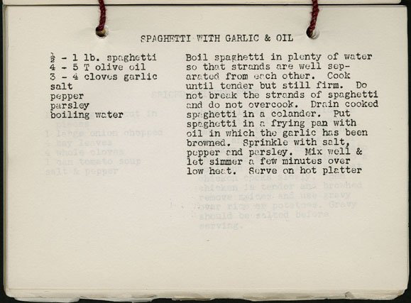 Boil spaghetti in plenty of water so that strands are well separated from each other. Cook until tender but still firm. Do not break the strands of spaghetti and do not overcook. Drain cooked spaghetti in a colander. Put spaghetti in a frying pan with oil in which the garlic has been browned. Sprinkle with salt, pepper and parsley. Mix well & let simmer a few minutes over low heat. Serve on hot platter.