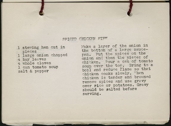 Make a layer of the onion in the bottom of a large saucepan. Put the spices on the onion and then the pieces of chicken. Pour a can of tomato soup over the top. Bring to a boil and reduce flame so that chicken cooks slowly. When chicken is tender and browned remove spices and use gravy over rice or potatoes. Gravy should be salted before serving.