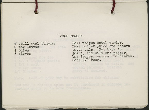 Boil tongue until tender. Take out of juice and remove outer skin. Put back in juice, add salt and pepper, bay leaves, onions and cloves. Cook ½ hour.