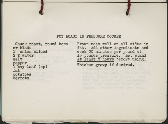 Brown meat well on all sides in fat. Add other ingredients and cook 20 minutes per pound at 15 pounds pressure. Let stand at least 8 hours before using. Thicken gravy if desired.