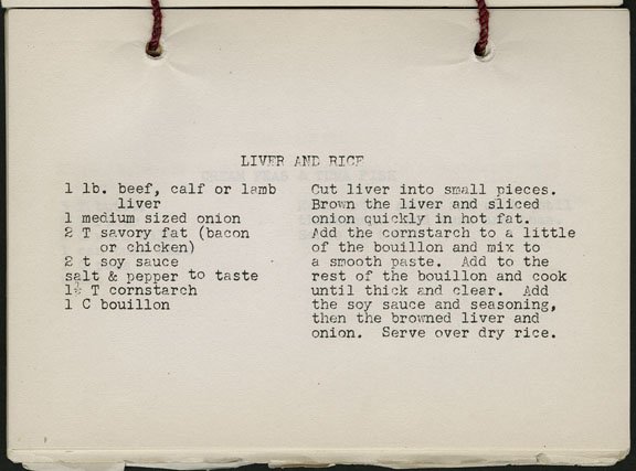 Cut liver into small pieces. Brown the liver and sliced onion quickly in hot fat. Add the cornstarch to a little of the bouillon and mix to a smooth paste. Add to the rest of the bouillon and cook until thick and clear. Add the soy sauce and seasoning, then the browned liver and onion. Serve over dry rice.