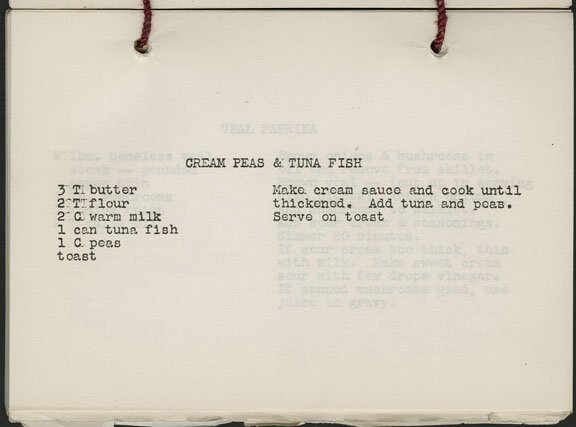Make cream sauce and cook until thickened. Add tuna and peas. Serve on toast.