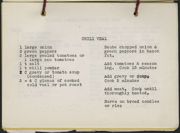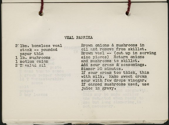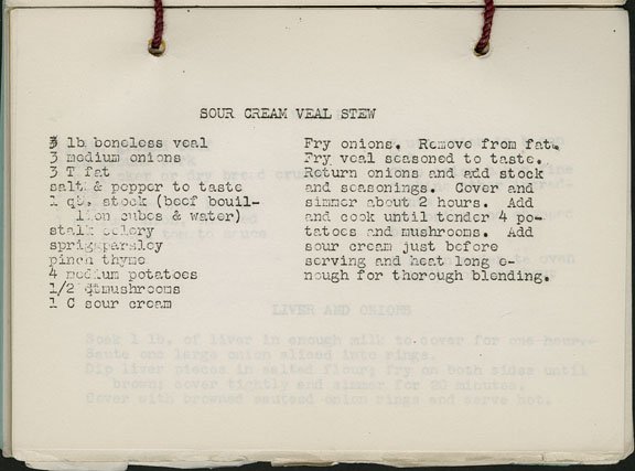 Brown onions & mushrooms in oil and remove from skillet. Brown veal—(cut up in serving size pieces). Return onions and mushrooms to skillet. Add sour cream & seasonings. Simmer 20 minutes. If sour cream too thick, thin with milk. Make sweet cream sour with few drops vinegar. If canned mushrooms used, use juice in gravy.