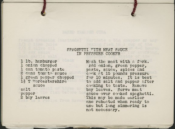 Add onion, green pepper, paste, sauce, spices and cook at 15 pounds pressure for 10 minutes. It is best to add salt and pepper after cooking to taste. Remove bay leaves. Serve meat sauce over cooked spaghetti. This may be made earlier and reheated when ready to use but long simmering is not necessary.
