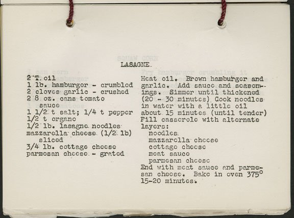 Heat oil. Brown hamburger and garlic. Add sauce and seasonings. Simmer until thickened (20-30 minutes). Cook noodles in water with a little oil about 15 minutes (until tender). Fill casserole with alternate layers: