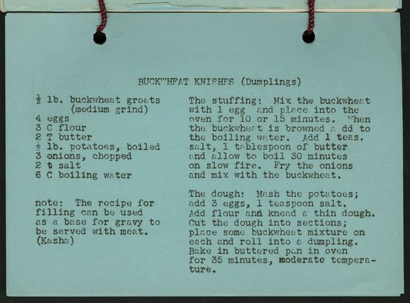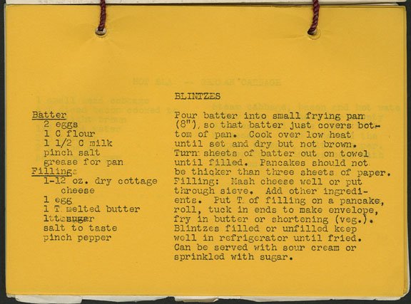Filling: Mash cheese well or put through sieve. Add other ingredients. Put T of filling on a pancake, roll, tuck in ends to make envelope, fry in butter or shortening (veg.). Blintzes filled or unfilled keep well in refrigerator until fried. Can be served with sour cream or sprinkled with sugar.