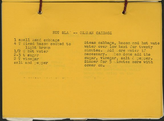 Steam cabbage, bacon and hot water over low heat for twenty minutes. Add more water if necessary. When done add the sugar, vinegar, salt & pepper. Simmer for 5 minutes more with cover on.