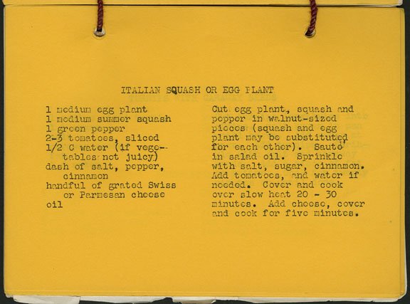 Cut egg plant, squash and pepper in walnut-sized pieces (squash and egg plant may be substituted for each other). Saute in salad oil. Sprinkle with salt, sugar, cinnamon. Add tomatoes, and water if needed. Cover and cook over slow heat 20-30 minutes. Add cheese, cover and cook for five minutes.
