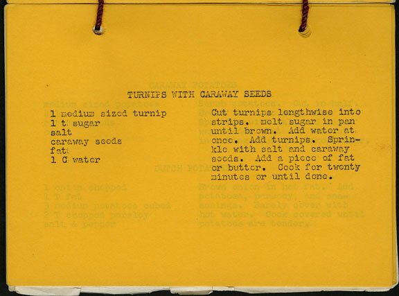 Cut turnips lengthwise into strips. Melt sugar in pan until brown. Add water at once. Add turnips. Sprinkle with salt and caraway seeds. Add a piece of fat or butter. Cook for twenty minutes or until done.