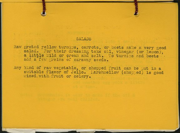 Raw grated yellow turnips, carrots, or beets make a very good salad. For their dressing take oil, vinegar (or lemon), a little milk or cream and salt. To turnips and beets add a few grains of caraway seeds.