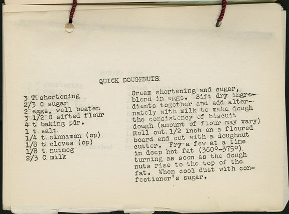 Cream shortening and sugar, blend in eggs. Sift dry ingredients together and add alternately with milk to make dough the consistency of biscuit dough (amount of flour may vary) Roll out ½ inch on a floured board and cut with a doughnut cutter. Fry a few at a time in deep hot fat (360°-375°) turning as soon as the doughnuts rise to the top of the fat. When cool dust with confectioner's sugar.
