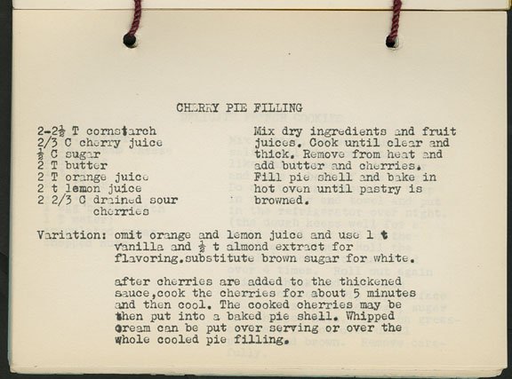 After cherries are added to the thickened sauce, cook the cherries for about 5 minutes and then cool. The cooked cherries may be then put into a baked pie shell. Whipped cream can be put over serving or over the whole cooled pie filling.