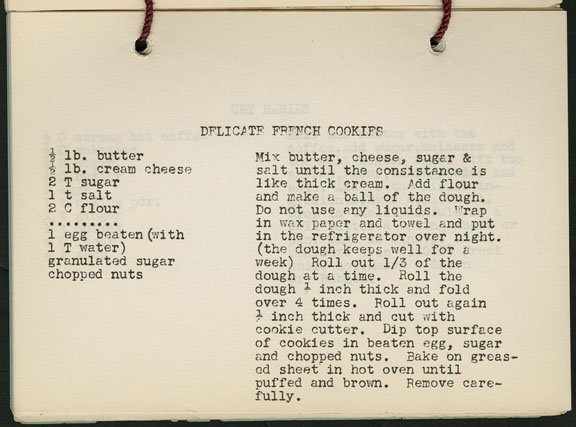 Mix butter, cheese, sugar & salt until the consistance is like thick cream. Add flour and make a ball of the dough. Do not use any liquids. Wrap in wax paper and towel and put in the refrigerator over night. (the dough keeps well for a week). Roll out ⅓ of the dough at a time. Roll the dough ¼ inch thick and fold over 4 times. Roll out again ¼ inch thick and cut with cookie cutter. Dip top surface of cookies in beaten egg, sugar and chopped nuts. Bake on greased sheet in hot oven until puffed and brown. Remove carefully.