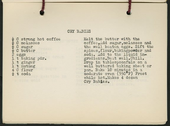 Melt the butter with the coffee. Add sugar, molasses and the well beaten eggs. Sift the spices, flour, baking powder and soda. Add to the liquid ingredients. Beat well. Chill. Drop in tablespoonfuls on a well buttered baking sheet or pan. Bake 10 minutes in a moderate oven (350°F) Frost while hot. Makes 4 dozen Cry Babies.