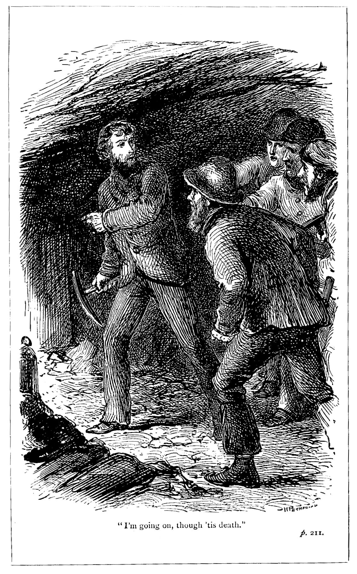 Suddenly the strange miner sprang to the front; fazed his companions with flashing eyes, and called out, in a deep voice rendered almost harsh by some pent-up emotion—“I’m going on, though ’tis death. Shut the doors upon me,” he added, “and I’ll cut the passage through!”