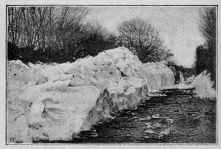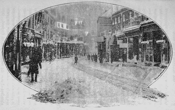 Soon after daylight, on the morning of Monday, March 9th, over the whole of the West of England, the fine weather that had prevailed for several weeks past gave place to a most unpleasant condition of affairs. The temperature fell, almost suddenly, and in the neighbourhood of Plymouth, Devonport, and Stonehouse, snow was falling fitfully from about an hour before noon. There was a gradually rising wind, that assumed menacing proportions as the afternoon wore on, while the snow that had, for the first few hours, thawed as soon as it fell upon the yet warm ground, was rapidly forming a white covering on every position exposed to the sky. At six o'clock, in the three towns some four or five inches of snow lay upon the ground, and the wind had increased to a hurricane. Slates began to start from the roofs of houses, and chimneys to fall, and in a very short time the streets assumed a deserted appearance, and all vehicular traffic was stopped. Advertisement hoardings were hurled from their positions with some terrible crashes, and in many instances the splinters were promptly seized by a thrifty populace and taken away for firewood. Many trees were blown down in the early part of the night. In Buckland Street, Plymouth, a tree[10] of sufficient size to block the roadway fell at about eight o'clock, and not long after another heavy tree fell from Athenæum Garden across Athenæum Street, the main road to the Great Western Railway Station, completely closing the thoroughfare. Our illustration, reproduced from a photograph taken by Mr. Heath of George Street, Plymouth, on the morning after the storm, gives a realistic idea of the condition of Plymouth streets, and of the quantity of snow that was blown about during the night.