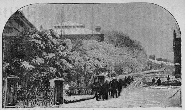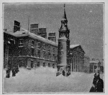 As to the quantity of snow that fell, accounts differ. There were huge drifts in most places; in others there was a comparatively level covering of many feet in thickness. The condition of a part of George Street, Plymouth, which received a very fair quantity, is artistically portrayed in the accompanying illustration, copied from a photograph taken on the morning of Tuesday by Mr. Heath, photographer, of Plymouth. According to observations made by Dr. Merrifield, of Plymouth, the[5] value of whose scientific researches into the mysteries of matters meteorological are beyond question, the quantity of snow and rain that fell between Monday evening and early on Wednesday morning was ·68. This was registered at the doctor's residence, which stands 125 feet above the level of the sea, and faces S.S.E. With the depth of snow in other places, this record will deal in due course.