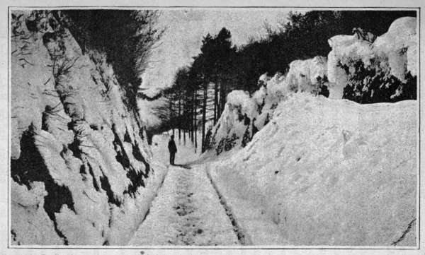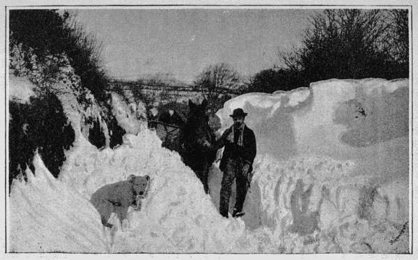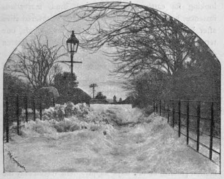 It is clear that during the whole progress of the storm the temperature was never very low. The great cold came from the strength of the wind. During the storm, and in the course of the severe days that followed, not more than five or six degrees of frost were registered, and on one day of the week, when there was snow on every hand, the thermometer never rose higher than freezing point. The wind, however, was terrific, its maximum force during the night being 10, and 12 is the highest possible. To this extraordinary velocity is due the fact that the visitation is best describable by the[4] term "blizzard." With a less violent wind, there would have been a great fall of snow, as great probably as that of January, 1881, when difficulties and disasters painfully comparable with those of the present year were spread broadcast over not only the western portion, but the whole of England, but it would have been a snowstorm and not a blizzard, and many of the phenomenal aspects of the visitation under notice would have been absent. In the course of the present narrative many remarkable effects due to the powdery nature of the snow will have to be recorded. Before concluding the meteorological portion of the subject, and getting on with the story, it may be well to observe that according to the best authorities a blizzard is caused by the fierceness of the wind, which blows the cold into the vapour in the atmosphere and consolidates it into fine snow without allowing time for the formation of a snow-flake. We are accustomed to associate ideas of gentleness and beauty and stillness with the fall of snow. The blizzard, which is apparently—but, of course, only in name—a new acquaintance, shews us the reverse side of the picture, and suggests nothing beyond merciless fury and destructiveness.