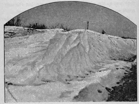 Among other peculiar and beautiful forms taken by the blizzard snow, and seen with great effect during the sunshine of the Wednesday after the storm, were the huge, shell-shaped hollows scooped out by the wind from the snow-drifts. An examination of many of our illustrations will reveal examples of this very unusual feature. In the accompanying scene, which is a view of a drift in the Liskeard cricket field, the peculiarity is very marked, the hollow being apparently sufficiently deep to cause the surface of the drift to overhang for some two or three feet.