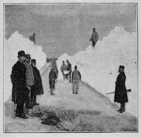 Some serious difficulties were encountered, and heavy[153] labour on the part of the civilian labourers and the soldiers was entailed. There were nearly ten miles of leat to be cleared, and much of the snow was frozen into hard solid masses, against which but slow headway could be made. In some places the leat was completely buried under frozen snow of great depth, and for hundreds of yards snow rose in drifts from ten to twelve feet in height, burying the rails guarding the leat, and rendering it difficult to trace its course accurately. The young Welsh soldiers worked well, and the services of the Marines were found invaluable.