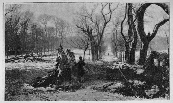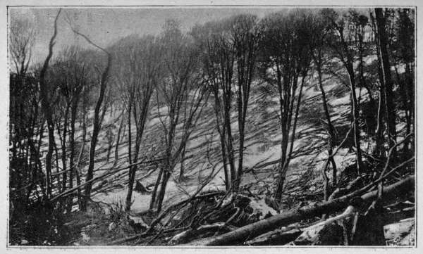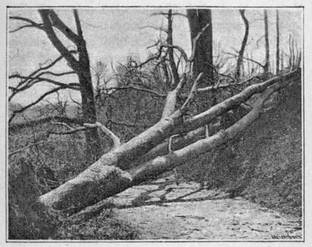 During the whole time the blizzard was raging, the wind varied from N.E. to S.E. The changes were very rapid, but this was the widest range. Along the coast the greatest severity appears to have been experienced from a point or two eastward of Teignmouth to Falmouth Bay, many towns exposed to the sea having to bear their share of the burden, and unhappily many valuable lives being lost through disastrous wrecks. If a map of the three counties of Devon, Cornwall, and Somerset be consulted, it will be found that, taking this portion of the coast as an opening through which the broad shaft of a hurricane entered, now sweeping in a north-easterly, and now in a south-easterly direction, the area of country that has sustained the heaviest damage will be embraced, the intensity of the violence inflicted gradually diminishing the further one travels towards the east, north, and west. Dartmoor forms a kind of centre of the chief scene of desolation, and Plymouth, being well within the range, has suffered far more severely than any other large town in the three counties. To the eastward, in particular, it is clear that the effects of the gale are not nearly so serious, though the fall of snow was pretty abundant all over the southern part of England. Outside[7] of Devon and West Cornwall there are no great lots of timber down, though here and there a fallen tree is observable.
