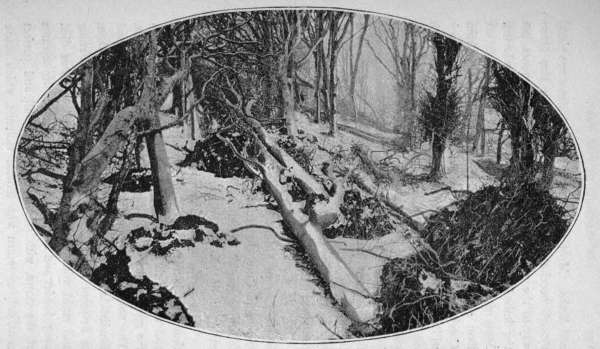 "Looking towards the woods opposite Maristowe House, the owner must witness such a wreck as never was before seen since the house has stood there. From the entrance of the road from Beer Ferris to Lopwell, trees of every description lie twisted and thrown in every direction, and the road itself must, for some time, be only available for traffic with care. The great trees in falling have crashed through others, and thousands of broken limbs are visible on every hand. On the other side of the Tavy towards Denham Bridge, the damage is great, and in the hollows, here and there, more than three weeks after the storm, were considerable quantities of snow. At Denham Bridge several very fine firs have gone, broken off short some five to eight feet above the ground in most cases, and in the Tavy here and there are other trees. On the road from Beer Alston to Tavistock one plantation of black firs, consisting of several hundred trees, has lost to the extent of nine trees out of every ten, and the cutoff ends of the trees jutting on the highway present a remarkable appearance. A little further away, on the[140] road to Milton Abbot, another fir plantation has nearly every tree down."